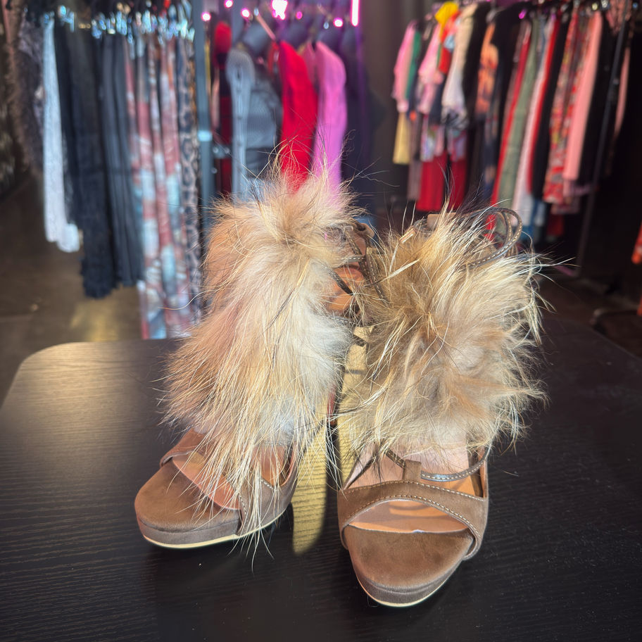 Strappy suede stilettos with plush fur accents and delicate ankle ties chic meets bougie