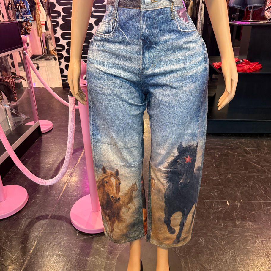 High-waisted straight-leg denim featuring bold running horse artwork with vintage western detailing. Structured waist that hugs your curves while giving powerful, main-character rodeo energy. These aren’t just jeans they’re arena attention.