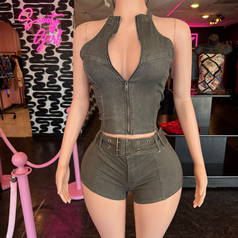 Structured halter zip-up top with matching fitted shorts and belt detail. Edgy, body-contouring, and made to turn heads after dark.